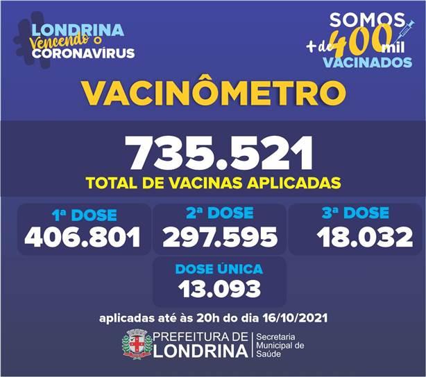A Prefeitura, por meio da Secretaria Municipal de Saúde, atualizou o vacinômetro neste domingo (17). Segundo o levantamento, foram aplicados até a noite de sábado (16), 4.358 doses da vacina contra a Covid-19. Deste total, 211 tomaram a primeira dose, 5 receberam a vacina de dose única, 3.380 a segunda dose e 762 a terceira dose de reforço. A cidade já tem 310.688 pessoas completamente imunizadas contra a Covid-19. A Prefeitura já aplicou 735.521 doses de vacinas contra a Covid.
