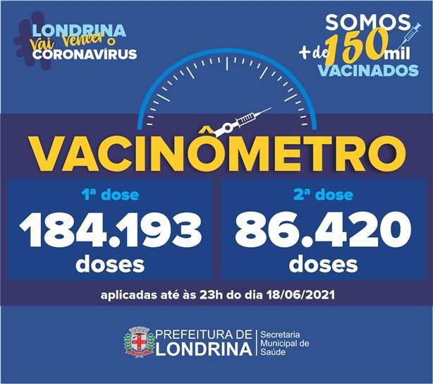 Londrina aplicou 184.193 primeiras doses da vacina contra a Covid-19, segundo o vacinômetro atualizado pela Prefeitura de Londrina neste sábado (19). Além disso, 86.420 pessoas receberam a segunda dose do imunizante.