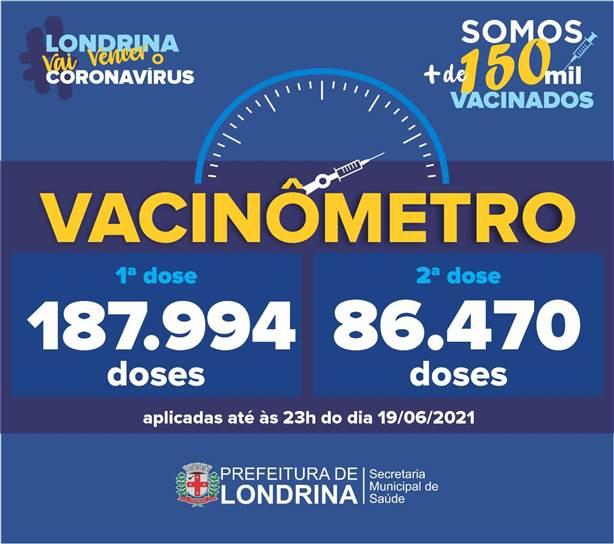 Londrina aplicou 187.994 primeiras doses da vacina contra a Covid-19, segundo o vacinômetro atualizado pela Prefeitura de Londrina neste domingo (20). Isso representa 32,6% da população. Além disso, 86.470 pessoas receberam a segunda dose do imunizante.