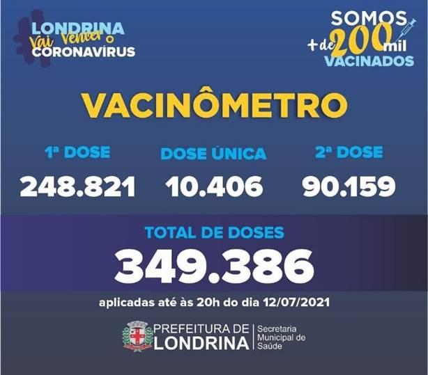 Quase 350 mil doses de vacinas contra a Covid-19 foram aplicadas em Londrina desde o início da campanha. Mais de 10 mil pessoas receberam a vacina em dose única. Ao todo, 959 tomaram a vacina da Janssen, braço farmacêutico da Johnson & Johnson, nas últimas 24 horas. A atualização do vacinômetro foi divulgada nesta terça-feira (13).