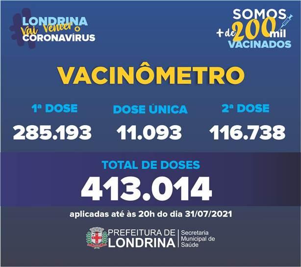A Prefeitura de Londrina, por meio da Secretaria Municipal de Saúde, aplicou mais 3.638 doses da vacina contra a Covid-19 até a noite de sábado (31). Segundo o Vacinômetro, deste total, 2.548 tomaram a primeira dose; 1.075 a segunda dose e 25 tomaram a vacina de dose única. A cidade já tem 127.831 pessoas completamente imunizadas contra a Covid-19. A Prefeitura já aplicou 413.014 doses de vacinas contra a Covid.