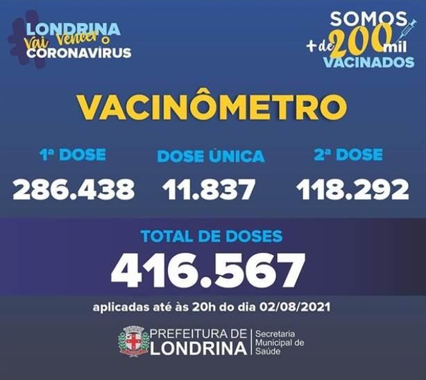 Londrina chegou a 130.129 habitantes totalmente imunizados contra a Covid-19. Destes, 118.292 receberam as duas doses da vacina e outros 11.837 receberam a vacina de dose única.