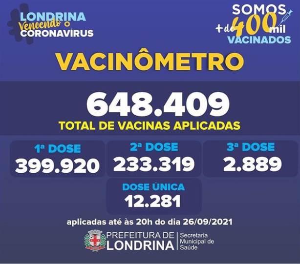 A Prefeitura, por meio da Secretaria Municipal de Saúde, aplicou até a noite de domingo (26), mais 4.841 doses da vacina contra a Covid-19. Segundo o Vacinômetro, divulgado nesta segunda (27), deste total, 575 tomaram a primeira dose, 3.199 a segunda dose e 1.067 pessoas receberam a terceira dose. A cidade já tem 399.920 pessoas imunizadas com a primeira dose, 245.600 pessoas completamente imunizadas contra a Covid-19 e 2.899 pessoas imunizadas com a terceira dose.