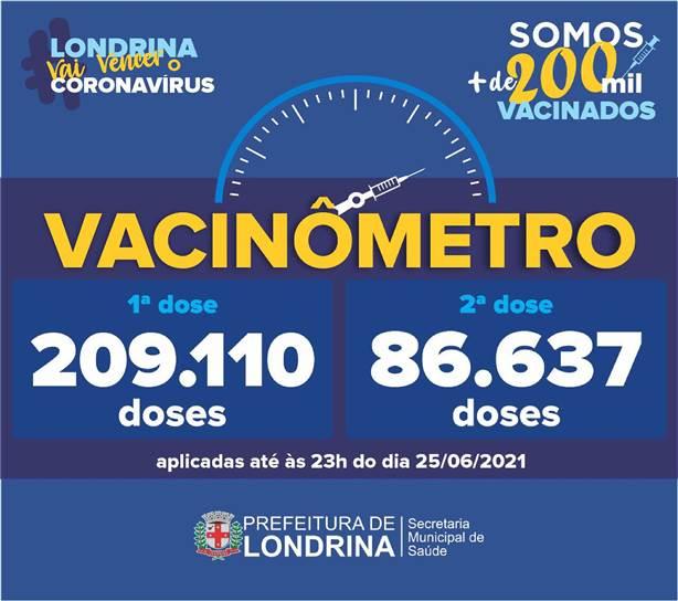 Londrina vacinou nas últimas 24 horas, 4.213 pessoas contra a covid-19. Assim, a cidade chega a marca de 209.110 imunizados com a primeira dose da vacina nesta sexta-feira (25). Até às 23h, 295.747 doses foram aplicadas desde o início da campanha. Segundo o vacinômetro, outras 15 pessoas receberam a segunda dose e completaram o ciclo de imunização, chegando a 86.637.