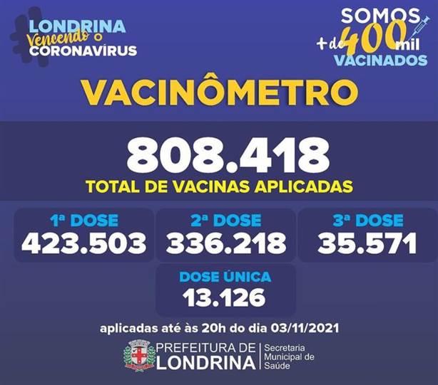 Londrina chegou a marca de mais de 808.418 doses da vacina contra Covid aplicadas, segundo o Vacinômetro divulgado nesta quinta-feira (4). Além disso, 349.344 pessoas estão completamente vacinadas na cidade.