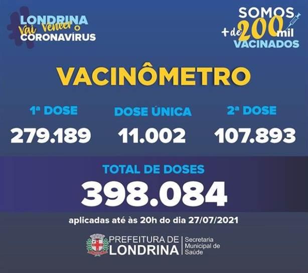 A Secretaria Municipal de Saúde aplicou mais 3.653 doses da vacina contra a Covid-19, segundo o boletim atualizado pela Prefeitura de Londrina na manhã desta quarta-feira (28). Deste total, 1.462 tomaram a primeira dose; 2.167 a segunda dose e 24 tomaram a vacina de dose única. A cidade já tem 118.895 pessoas completamente imunizadas contra a Covid-19. A Prefeitura aplicou 398.084 doses de vacinas contra a Covid.