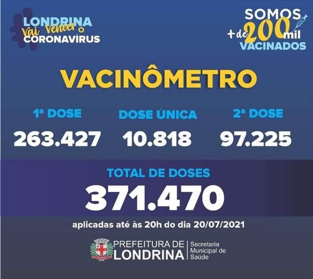 Londrina vacinou 3649 pessoas contra Covid-19 em 24 horas. A atualização do vacinômetro foi divulgada nesta quarta-feira (21).