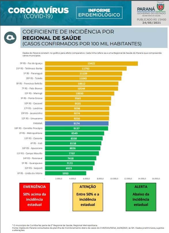 Em relação as mortes, a regional de Foz do Iguaçu também lidera, com uma taxa de 272,4 a cada 100 mil habitantes.