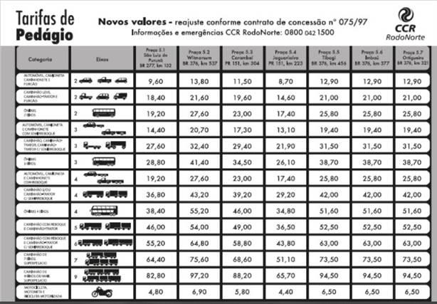 Com essa aumento, o valor para carros que passarem peles pedágios de Ortigueira e Imbaú, nos Campos Gerais passam a pagar R$12,90. Já caminhões podem pagar até R$ 94,50.