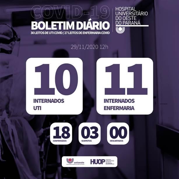 O Hospital Universitário do Oeste do Paraná anunciou nesta manhã (29), mais uma morte por Covid-19, em Cascavel. O paciente, de 68 anos, morador de Medianeira, estava internado desde o dia 15/11 na unidade, e evoluiu a óbito nesse sábado (28).