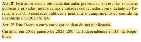 Um decreto publicado no Diário Oficial do Paraná na quarta-feira (20) autoriza a retomada das aulas presenciais em escolas estaduais públicas e privadas, que estavam suspensas desde março de 2020, em razão da pandemia de coronavírus.