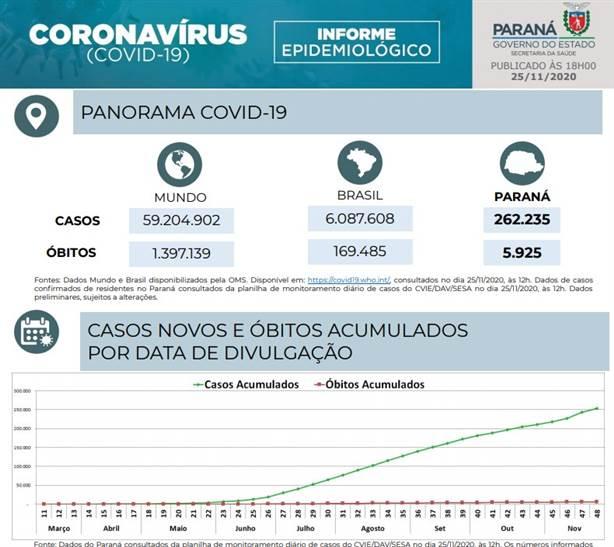 A Secretaria de Estado da Saúde divulgou nesta quarta-feira (25) mais 1.823 casos confirmados e 48 mortes em decorrência da infecção causada pelo novo coronavírus. A Sesa registra também 1.981 casos confirmados retroativos do período entre 27 de abril à 23 de novembro. Os dados acumulados do monitoramento da Covid-19 nesta quarta-feira mostram que o Paraná soma 262.235 casos e 5.925 mortos em decorrência da doença.