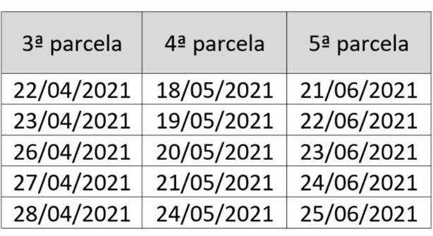 Assim, as três parcelas restantes tiveram seus prazos adiados em um mês: a 3ª, que deveria ser paga em março, teve seu prazo postergado para abril, e assim sucessivamente até a 5ª e última parcela, em junho.