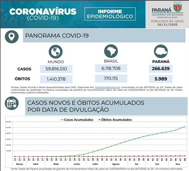 A Secretaria de Estado da Saúde divulgou nesta quinta-feira (26) mais 2.346 casos confirmados e 64 mortes em decorrência da infecção causada pelo novo coronavírus. A Sesa registra também 2.058 casos confirmados retroativos do período entre 5 de abril à 24 de novembro que estavam com investigação em aberto e agora foram encerrados como casos confirmados e automaticamente computados no sistema. Os dados acumulados do monitoramento da Covid-19 mostram que o Paraná soma 266.639 casos e 5.989 mortos em decorrência da doença.