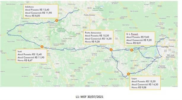 Confira a projeção dos valores para as atuais e novas praças de pedágio no Paraná: