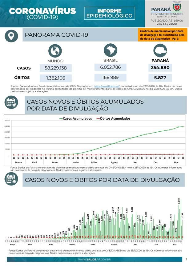 A Secretaria de Estado da Saúde divulgou nesta segunda-feira (27) mais 707casos confirmados e 27 mortes em decorrência da infecção causada pelo novo coronavírus. A Sesa registra também 1.032 casos confirmados retroativos do período entre 24 de maio à 21 de novembro. Os dados acumulados do monitoramento da Covid-19 nesta segunda-feira mostram que o Paraná soma 254.880 casos e 5.827 mortos em decorrência da doença.
