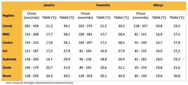 Tabela- Valores das médias mensais históricas da faixa de variação da chuva, temperaturas mínimas e máximas por região do Paraná nos meses de janeiro, fevereiro e março.