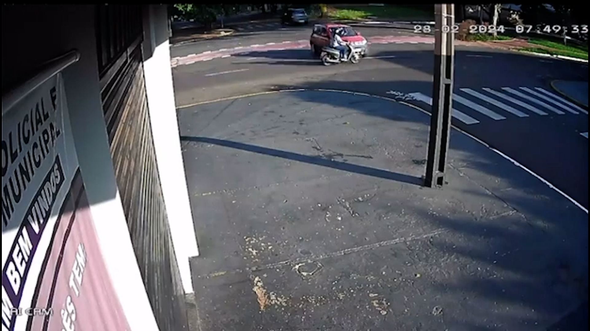 Nas imagens é possível ver o momento exato da colisão entre um Fiat Uno e uma Honda Biz, registrado nesta manhã (28) por volta das 8h10.