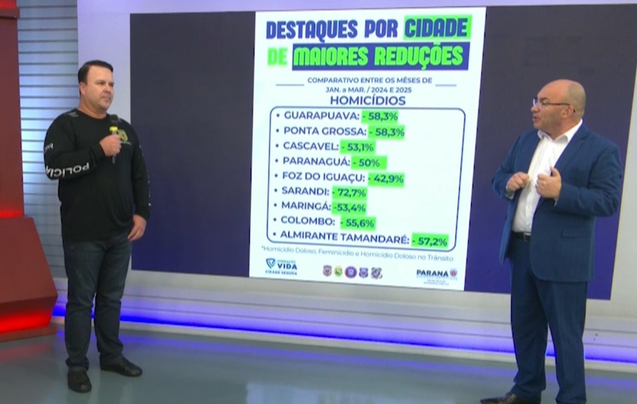 Os dados são da Secretaria de Segurança Pública do Estado do Paraná e levam em consideração os meses de janeiro a março de 2025, em comparação com o mesmo período de 2024.