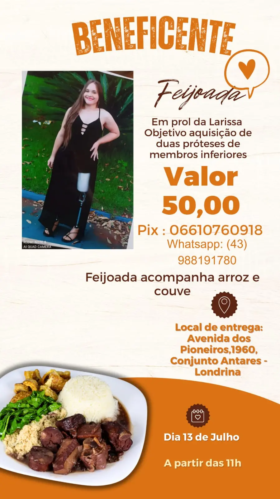 A ideia veio com a ajuda da família: promover uma feijoada para arrecadar fundos e comprar uma nova prótese, que com o processo de adaptação fica em cerca de R$ 200 mil. A campanha já está disponível e a retirada das marmitas será no dia 13 de julho, a partir das 11h. O valor da unidade acompanhada de arroz e couve é de R$ 50,00.