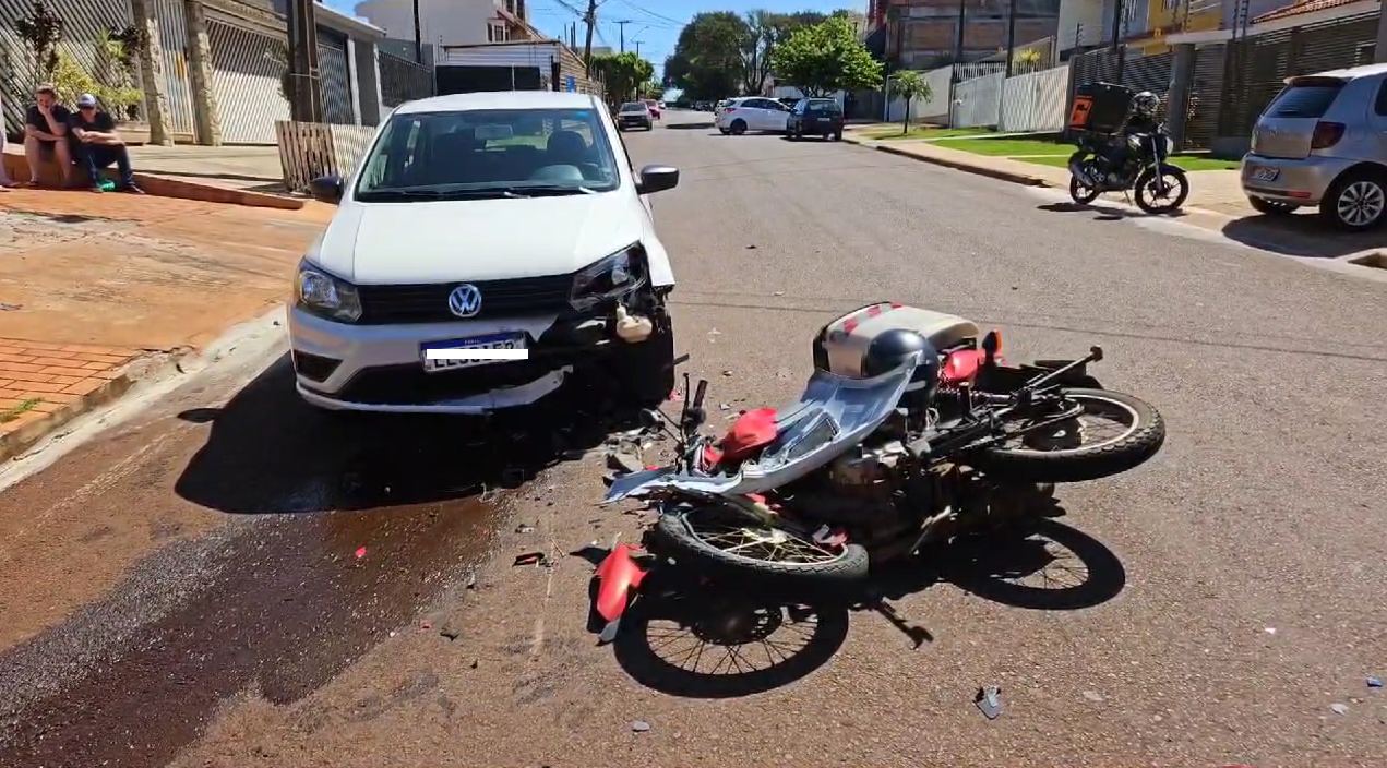 Um acidente envolvendo um Volkswagen Gol e uma motocicleta deixou um homem de 28 anos ferido na tarde desta terça-feira (17), no Centro de Cascavel. A colisão ocorreu no cruzamento das ruas Natal e Marechal Deodoro.