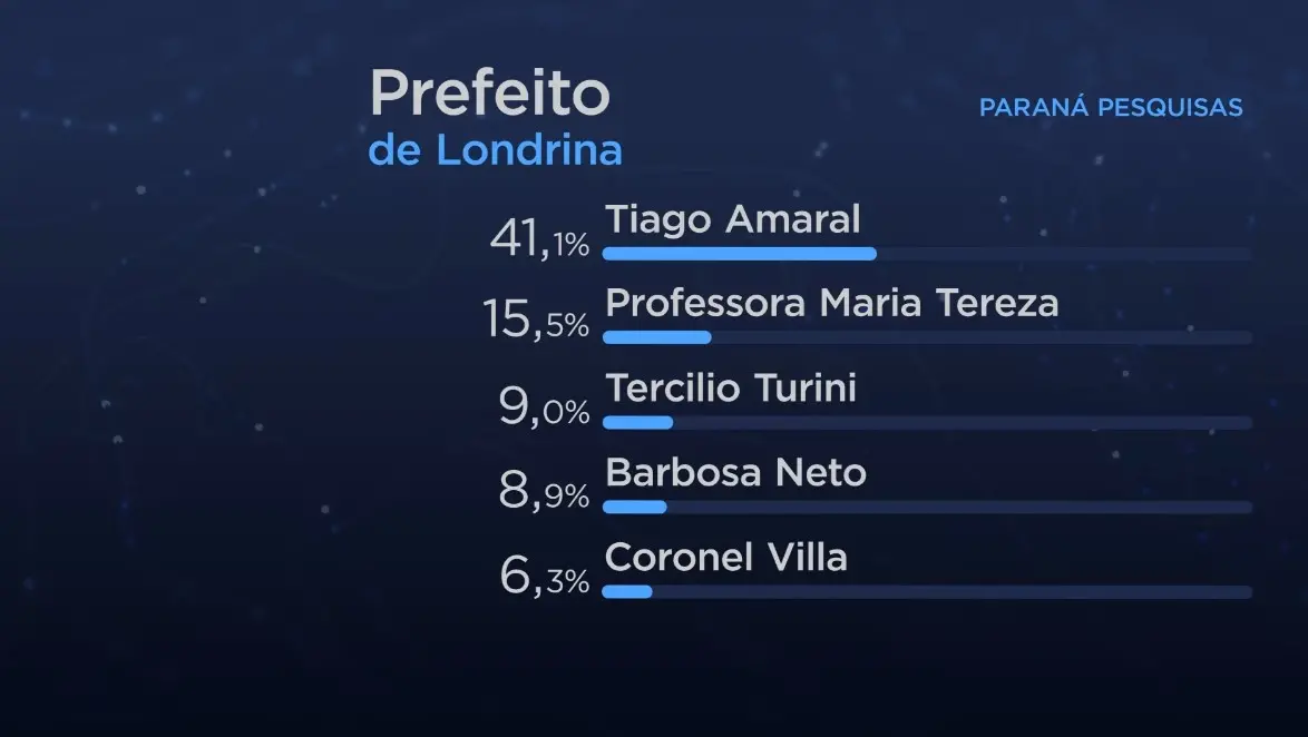 A Paraná Pesquisas ouviu 710 eleitores entre 19 e 22 de setembro, com as intenções de voto para prefeito de Londrina, e mostra Tiago Amaral (PSD) em primeiro lugar com 41,1% das intenções de voto. Em segundo está a Profª. Maria Tereza (PP), com 15,5%, seguido de Tercílio Turini (MDB), com 9,0%. Barbosa Neto (PDT) aparece na quarta posição com 8,9%. Coronel Villa (PSD) aparece com 6,3%, em quinto lugar. Diego Garcia (Republicanos) com 3,9% e Isabel Diniz (PT) com 3,2%.