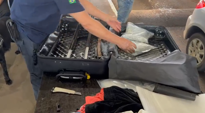 A droga foi identificada pelo cão farejador Echoes, da Receita Federal, que sinalizou irregularidades no compartimento da bagagem. Durante a abordagem, os servidores realizaram uma vistoria detalhada e encontraram o entorpecente.