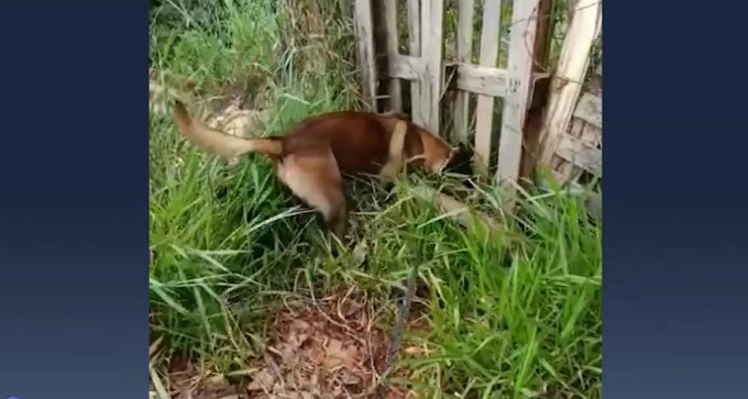 O cão K9, tentava, com seu bom faro, encontrar as drogas em meio ao matagal, junto com os policiais.